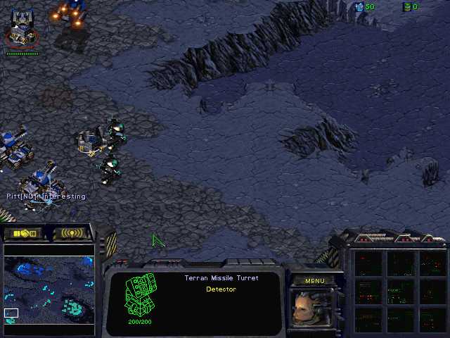 Praetor thought he had found the key to Johnny's strategy with the early air he faced. He established a command center in the lower left resource point and began producing goliaths to counter Johnny's air. Both players started down the tech tree to covert ops. Johnny found the new expansion quickly with comsat. He decided to focus on resource denial. He first established a strong point of a tank and two turrets on the middle left expansion's ledge. Then he moved down a SCV and made a turret just out of sight of the lower left expansion. Despite my initial misgivings, I soon became a believer as the turret finished. Johnny moved in two tanks next to the turret, as well as two science vessels and two wraiths. The tanks began assaulting praetor's command center. Praetor counterattacks with four goliaths. They quickly kill the science vessels, but not before both tanks are Dmatrixed. The goliaths die without scratching the paint on the tanks. The SCVs begin falling in earnest, and Praetor tries again with four more goliaths. These mechanical warriors also fall without effect. Realizing he will be unable to win the ground fight with his resources, praetor sends in four wraiths. They sit just outside the covering fire of the turrets and attack the tanks, when Johnny sets his wraiths on them. Both sides cloak but Johnny has a ready comsat and forces Praetor's wraiths back to turret cover. Praetor returns when he has enough comsat, but Johnny's superior unit control kills the remaining forces. The last buildings on the expansion fall in flames.