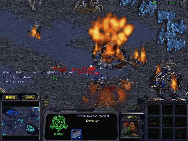 Praetor started to feel the pressure and decided he won't go out like a punk. He takes the forces which have finally razed Johnny's main and attack the middle right expansion. He is nearly unnopposed at first and kills all the mining SCVs. Johnny's relief column from the upper right expansion saves the command center with a fierce tank and goliath assault. Johnny counters with a twelve marine attack in the center, but the 2/0 goliaths and wraiths mow down the unupgraded marines in a blood bath. Praetor still refuses to give up hope. He makes a weak vulture attack on the middle left expansion, repelled by a marine counterattack. He then spots a large concentration of tanks massing to destroy him and tries to nuke them. Johnny ends the threat with a swift comsat.