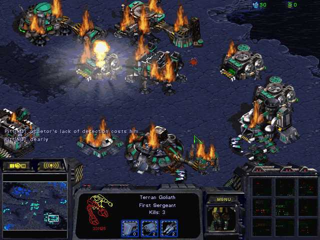 Praetor, mining no resources and realizing he has lost, sends his final two goliaths to the lower left to go out in a blaze of glory. The are quickly destroyed by a SCV/marine combination. Johnny begins shelling Praetor's helpless main base with arclite cannon fire and Praetor gracefully surrenders.