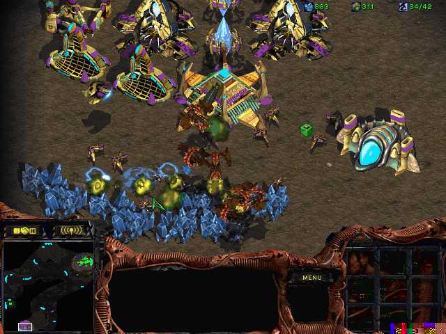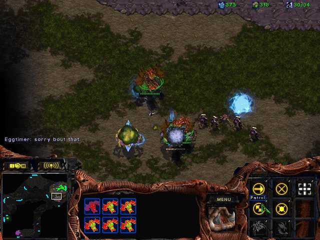At the start of the game, I decided to do a simple hydra build, but then changed my mind. I started out with a 9 pool, scouting for a protoss encampment. But, I decided to pull back and defend in case. A probe could be seen at the very edge of my fog of war. I commented on it, then killed it with a few lings. I made a gut move and threw up a sunken for defense, then made a quick extractor and drones, putting them on gas. Still no offense, but I was soon to figure out why. I started a lair without a den, changing my strategies for mutas, hoping he was massing zealotsaor going for an early expansion.