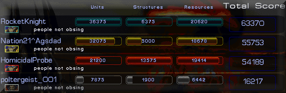 For Vengeance RocketKnight, done watching Poltergeist be utterly humiliated, announces that he is pissed. So pissed, that he attacks both Poltergeist's starting point (which has just been colonized by Agsdad) and Agsdad's main base. So, being the crafty Protoss Executor he is, Agsdad tells Homicidal to attack RocketKnight. I'm not even going to attempt to explain what happens in words. Instead, here is a picture.