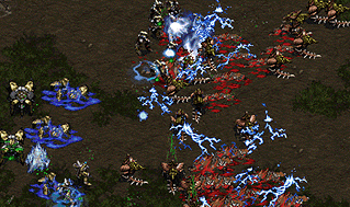battle ensues, with 30+ hydras engaging 5 goons, 8 zealots and 5 templars