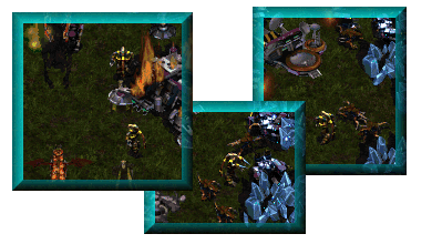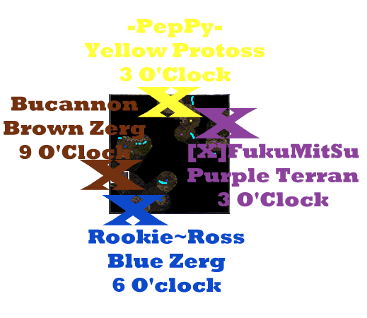 This game started like every other game starts. With someone asking for a game. It took awhile, but the game was finally made. I was originally(sp?) going to play with my partner, Micron-[DX], but I found out that one of the players already had a partner that was coming. So then I was forced to obs. The teams were [X]FukuMitSu(aka Fuku) and Rookie~Ross(aka rookie). Their opponents were -PePpy-(aka Peppy) and his partner, Bucannon(aka Buc). The game started with Fuku landing his purple Command Center at the mid right position, Rookie spawning himself a blue Hatchery at the bottom position. While Peppy warped his yellow Nexus at the top position, and his partner Buc spawned himself a brown Hatchery at the left position.