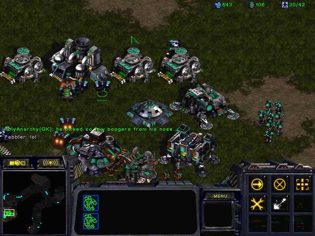 I started off hoping that Pebbler was zerg, because I was almost done prefecting my Tank Push. I started off with a semi-wallin to protect my peon line, and I sent an SCV scouting. He discovered a nosy, robotic probe gliding its metal, shiny butt up my ramp. It chased him back to my base, where i had almost finished a rax, and a depot was already done. That evil probe then set up an offensive refiney/extractor/assimilator trick, and ran. I made a bunker by my rax and popped out a marine, eventually making 4 and killed the Assimilator. He told me he didn't cancel because he wanted to delay gas, because he had trouble stopping the tank push. What a coinky-dink.