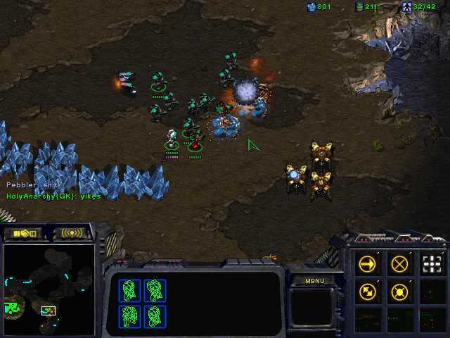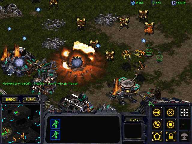 By now, I had expanded to the upper left island, but he then dropped 2 goons and i lifted. In ran 6 sairs, and there went my nuke silo and exp. After countless exp attempts, at the 3 and 12 start locations AND their naturals, I went to the mineral only spot along the 12 spot. Now I was screwed. More goons, reavers,zealots, and sairs rushed in, D-webbing my tanks and bunkers and killing my few vessels and wraiths. Now I played hide the depot, and told him where my exp. In ran a bunch of goons and, even though my mighty scv's were brave, they were killed. I gave him a GG and left, cursing.