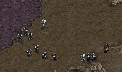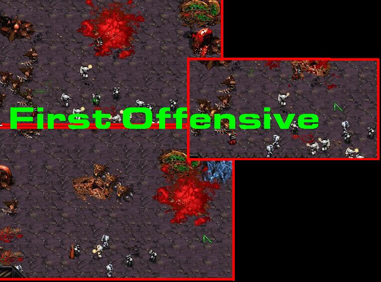 Having few available troops at the time, JakobderLudner makes use of the five m&m that had just arrived on the scene. The majority of the marines succumb to the flyers' attacks but the Magistrate micromanages his medics quickly and two marines are left to destroy the rest of the base. Between the two of them, they destroy six mutalisks, and (amazingly) the gargantuan living behemoth known as the spire. To the right is a picture of how big the force is, just to give you an idea of what caused the death of so many.